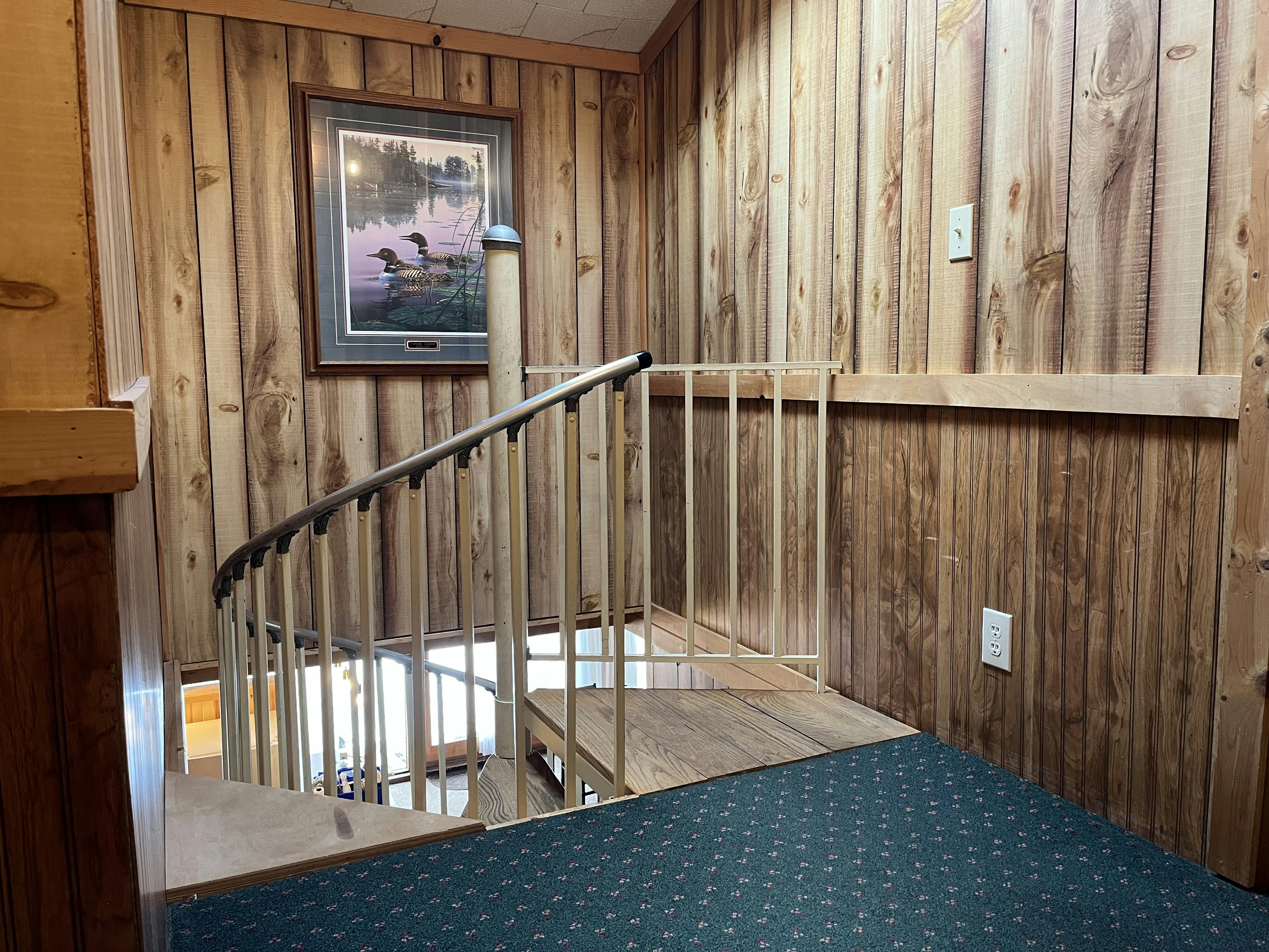 Lodge 12, the "Bear Den", is an apartment located on the lakeside of the lodge. A little bit funky, a lot of room. Circular stairway leads to the bedrooms. Three air conditioned bedrooms upstairs, one with a queen bed, one a queen and a twin, one with two full beds. One full bath with shower downstairs, one full bath with shower upstairs. Jetted jacuzzi room with skylight upstairs. Large kitchen with breakfast bar and dining area. Living room with gas fireplace, wrap around sofa, and picture windows. Youtube TV, WiFi, and fire pit and barbecue grill on patio. Share main pier.
